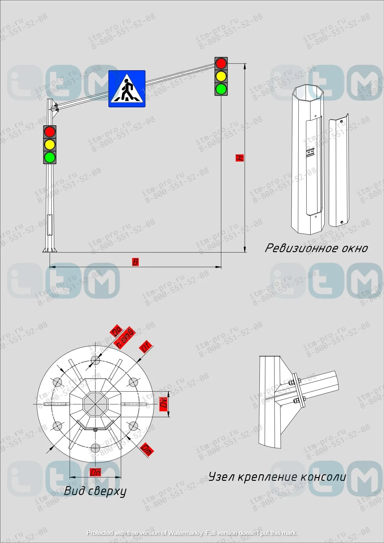 Опора светофорная консольная, также называемая ОГСГ, обычно приобретается для крепления малогабаритных светофоров, дорожных знаков, камер видеонаблюдения, светильников.Высота: 6,15 метров